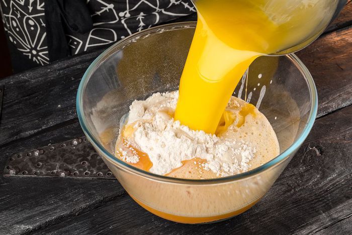 Добавить остальную муку и растопленное сливочное масло.