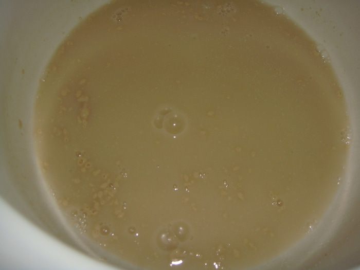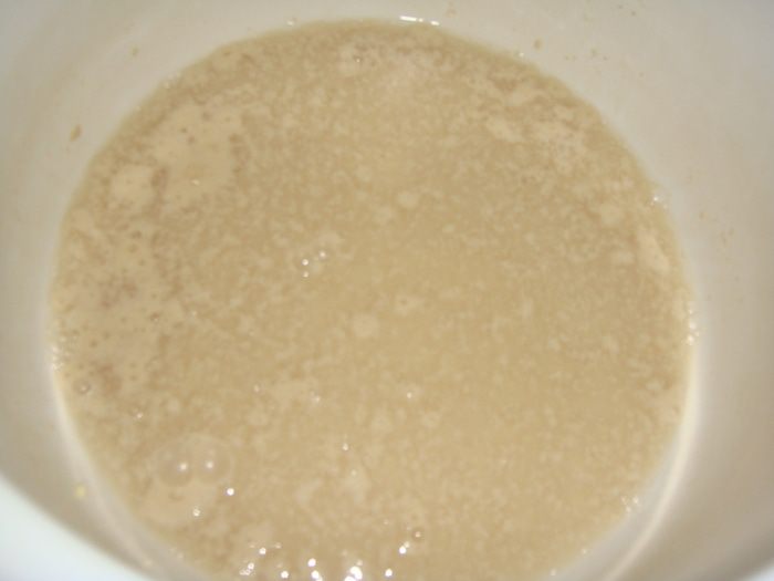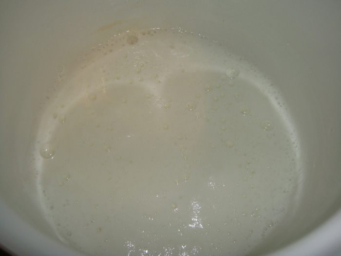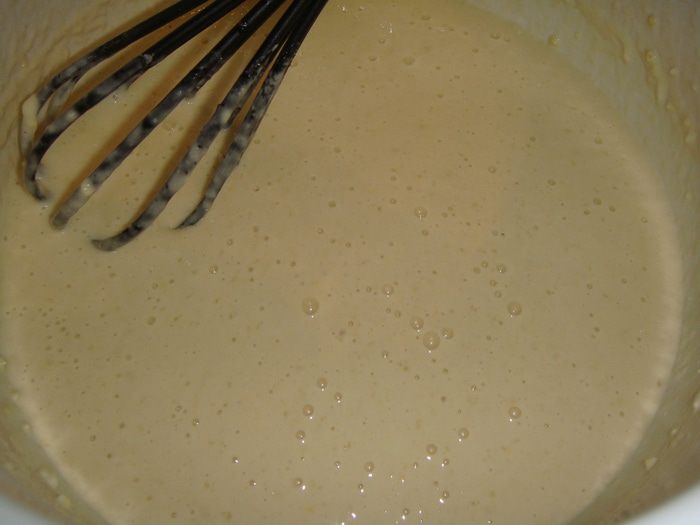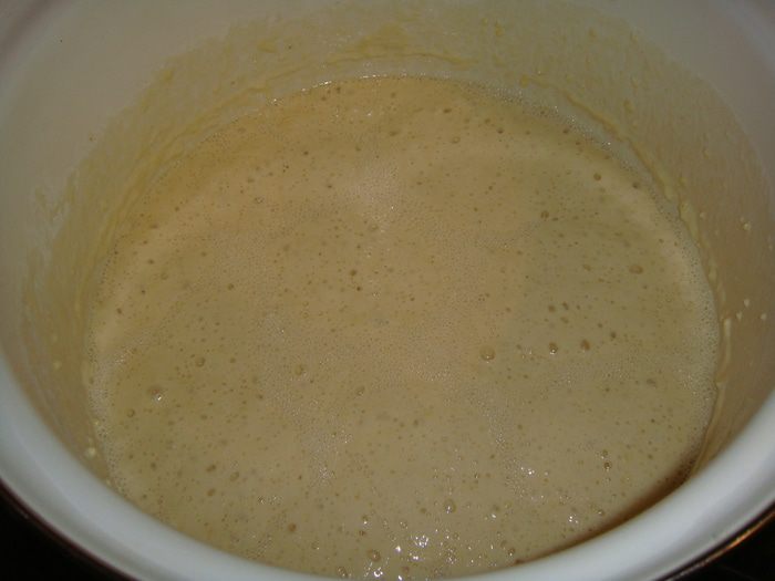Через 30 минут тесто начнет пениться. Можно начинать жарить блины.