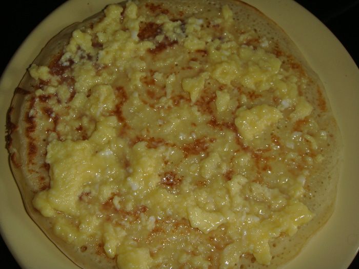 Влить яйца в масло, постоянно помешивая заварить яйца, на медленном огне. На это уйдет где-то 3 минуты.
