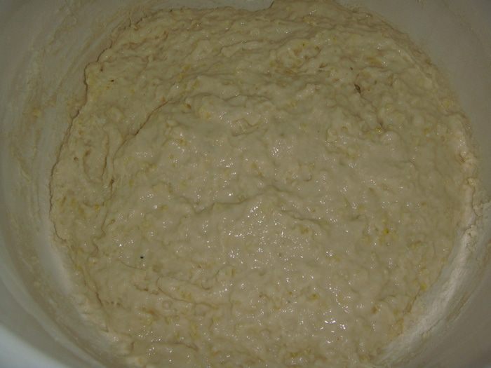 Всыпать муку, перемешать, накрыть емкость с тестом полотенцем и оставить на 8 часов при комнатной температуре.
