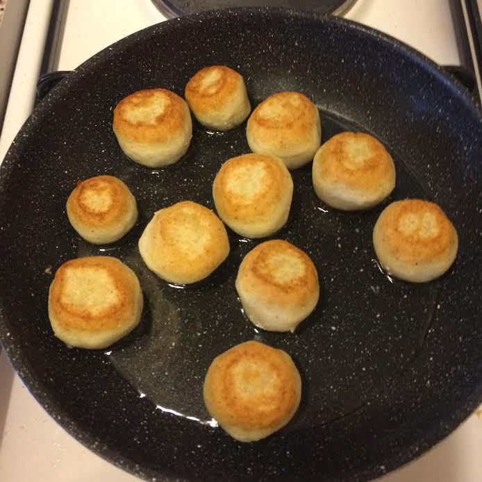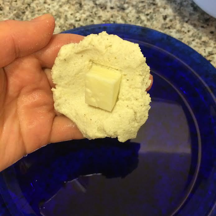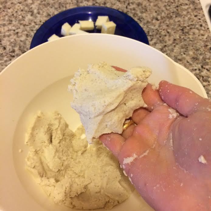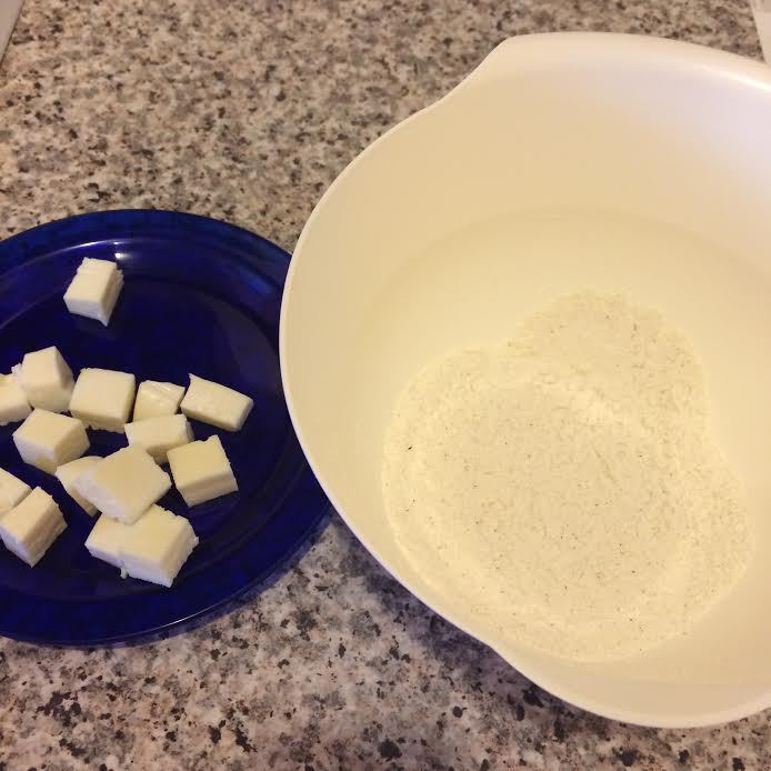 Муку просеять в миску, добавить соль (у меня сыр сулугуни молодой и не соленый, по этому я добавила соль, если ваш сыр соленый, то соль можно не добавлять). Сыр нарезать кубиками.