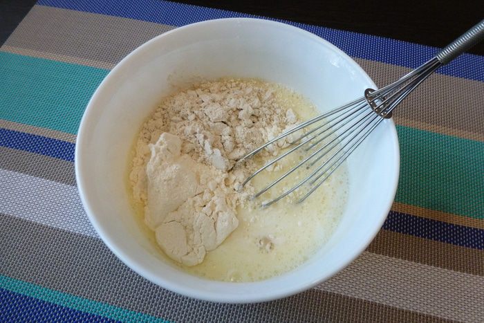 Немного взобьем яйца, кефир, сахар и соль. Добавим пшеничную овсяную муку «Рязаночка», разрыхлитель. Если тесто будет густовато, то добавьте кипяченой воды до нужной консистенции.