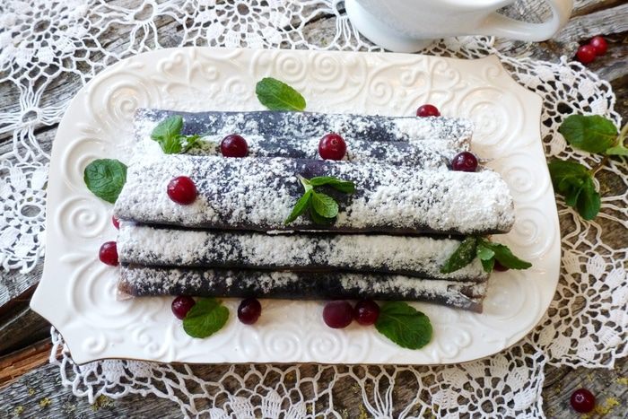 Черничный блинчик смазываем кремом и сворачиваем в трубочку. Укладываем на тарелку горкой.