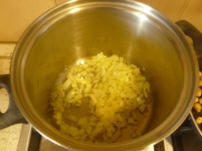 В кастрюле с толстым дном разогреть 1 ст. л. масла, обжарить мелко нарезанный лук.