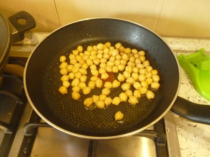 В сковороде разогреть 1 ст. л. масла, выложить нут и обжарить, помешивая, до золотистой корочки.