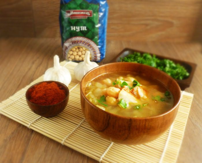 Постный суп с жареным нутом, необычайно ароматный, благодаря щепотке копченой паприки. Рыба в супе предварительно маринуется в мисо-пасте и запекается.