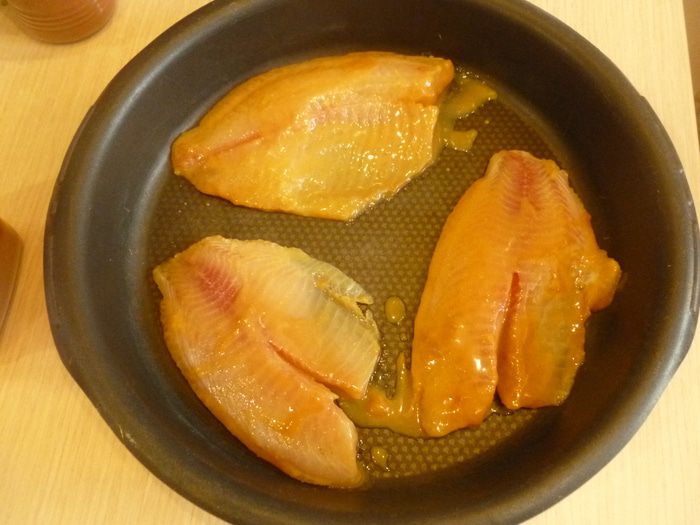 Разогреть гриль до 250°С. Рыбу отряхнуть и выложить в форму для запекания. Поставить на верхний уровень на 10-15 минут. Затем рыбу разрезать на небольшие кусочки.
