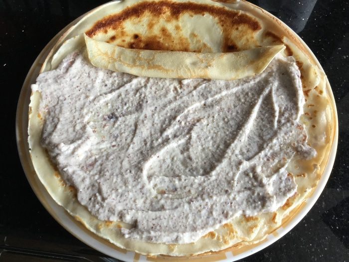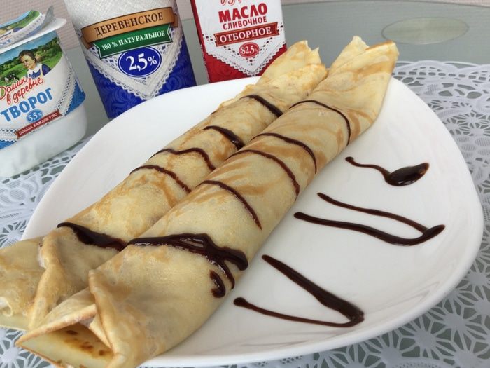 Для начинки возьмите нежный 5,5% творог «Домик в деревне» и любимые орешки. Блины можете приготовить по своему любимому рецепту, я же делюсь рецептом своей мамы. Они для меня самые любимые.