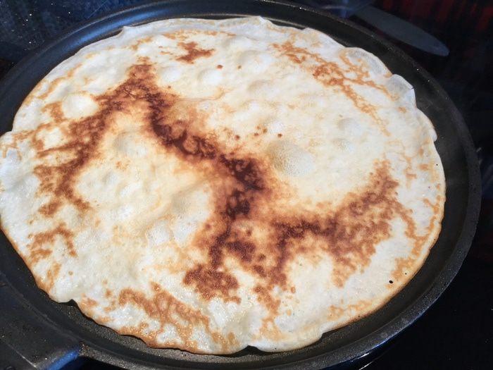 Разогрейте сковороду для блинов и выпекайте тонкие блинчики на среднем огне.