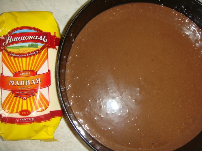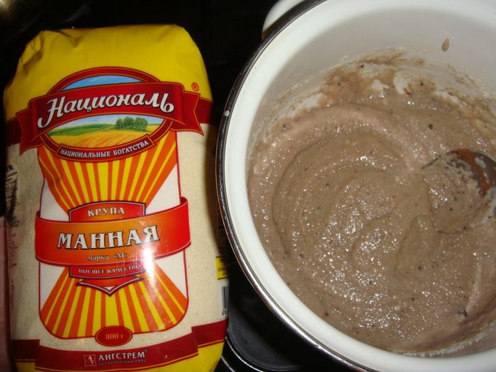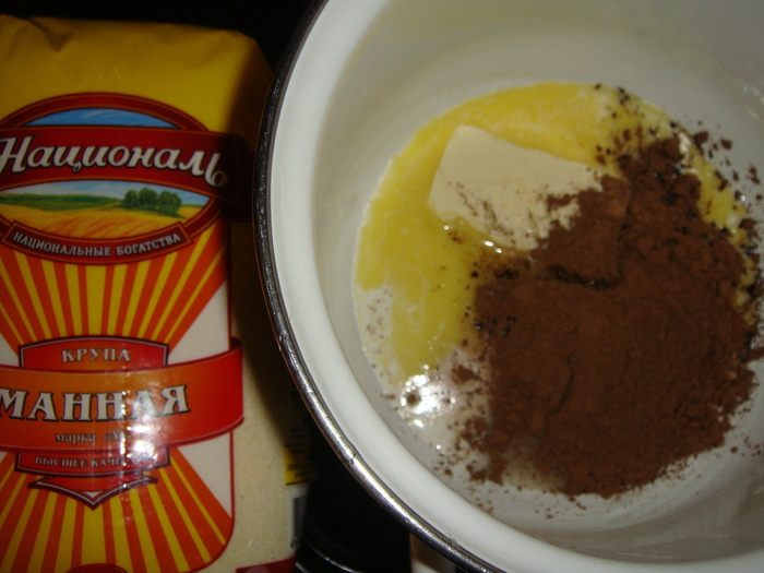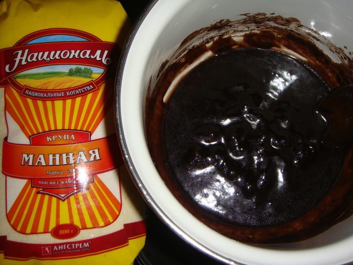 Всыпать манную крупу ТМ «Националь» и варить на медленном огне в течении 5-ти минут. Добавить какао, перемешать.