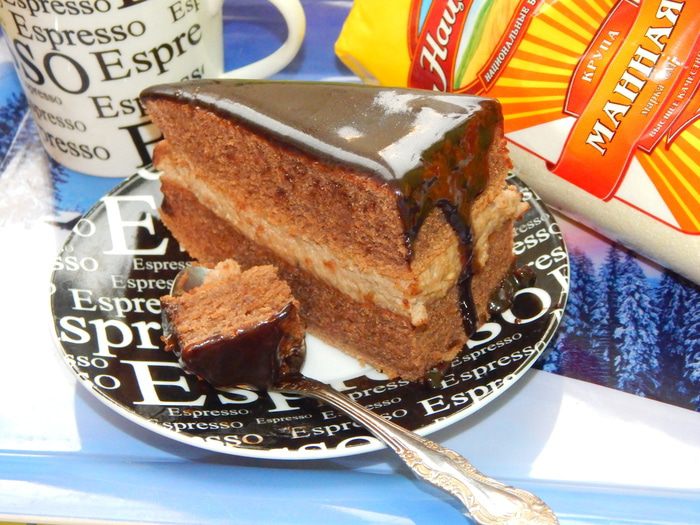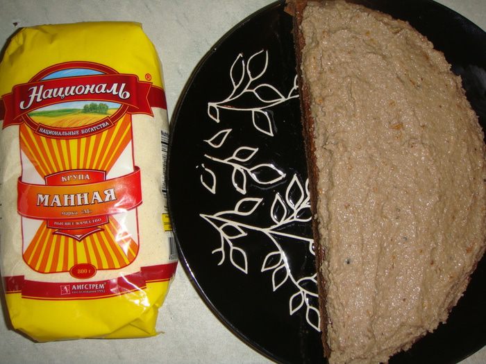 Корж разрезать на две части. Выложить на одну крем и накрыть второй.