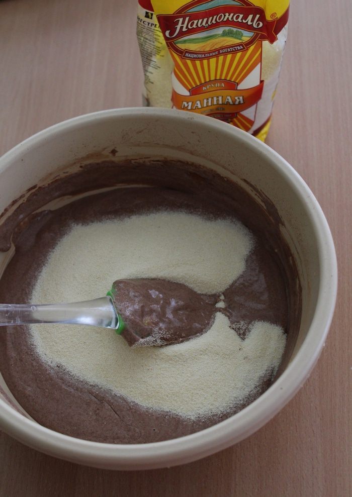 Всыпаем манку ТМ «Националь», снова хорошо перемешиваем. Тесто должно быть, как густая сметана.