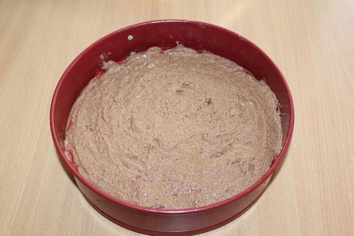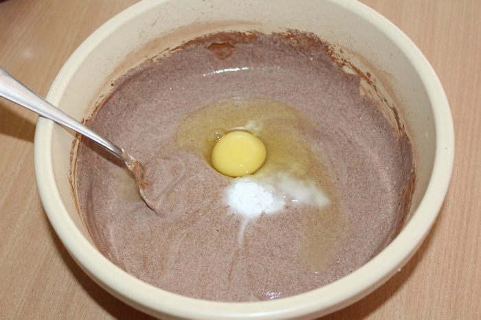 Смешиваем сметану с какао, коньяком и сахаром. Добавляем соду и яйцо, перемешиваем.