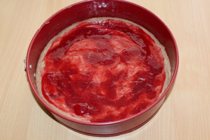 Половину теста равномерно выкладываем в форму. Сверху на тесто равномерно выливаем малиновый джем или варенье.
