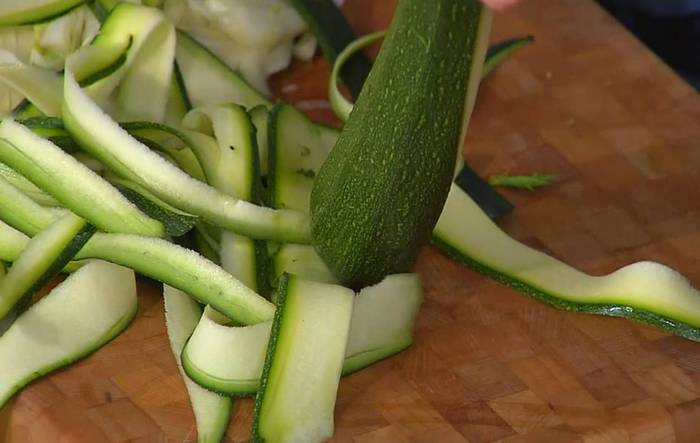 Цукини нарезать вдоль тонкими полосками — можно воспользоваться овощечисткой.