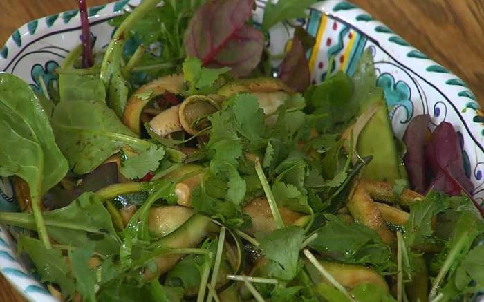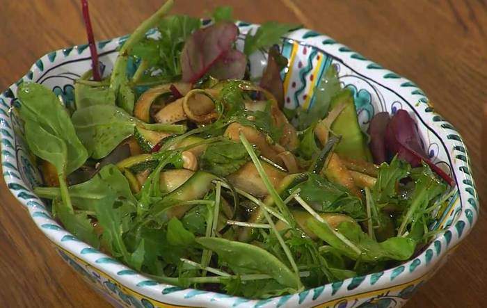Главное здесь, конечно, фенхель — пока не появились настоящие, с грядки, помидоры и огурцы, он спасает все салаты! Цукини можно заменить кабачком, но он должен быть свежим, хрустящим. Вместо фундука подойдут подсушенные грецкие орехи, пекан и даже арахис, а если не любите кинзу, возьмите другую яркую травку — базилик или мяту. В маринад хорошо добавить немного горчицы или меда.