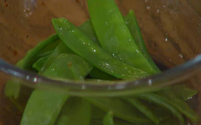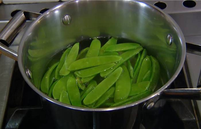 Стручковый горошек опустить на несколько минут в кипящую воду, затем откинуть на дуршлаг и обдать ледяной водой.