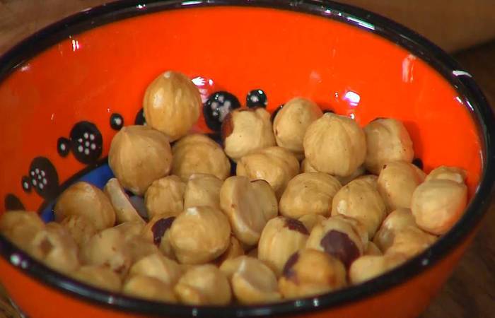 Ядра фундука разрезать пополам.