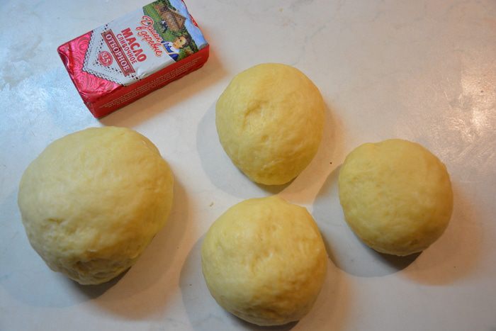 Разделить тесто на 4 части: 1 побольше и 3 одинаковые.