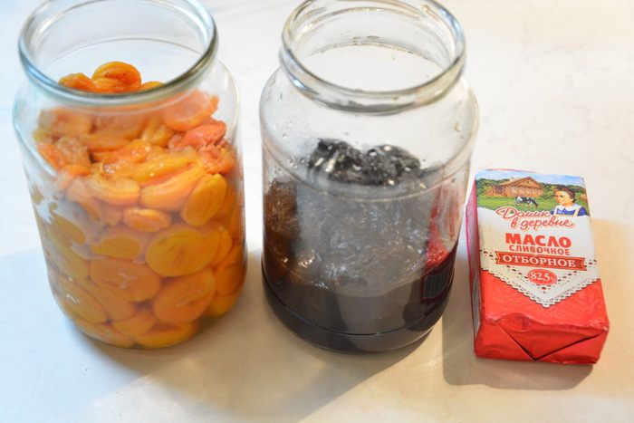 Курагу и чернослив хорошо промыть. Замочить в кипятке на пару часов, а лучше на ночь: 400 г кураги и 250 мл воды, 200 г чернослива и 130 мл воды.