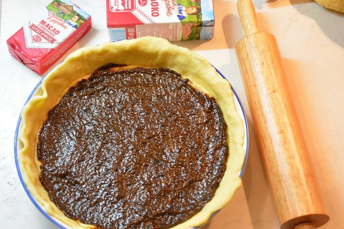 Третью часть раскатать в круг и выложить сверху.