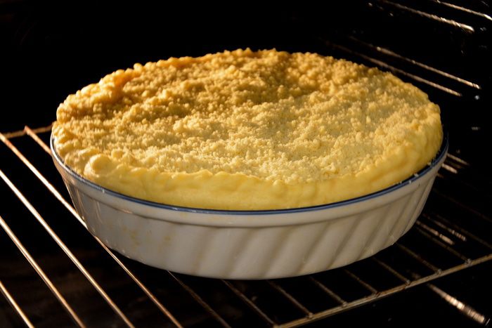 Крошка: очень холодное масло натереть на терке, смешать с мукой и сахаром. Тщательно растереть в крошку. Выпекать пирог в разогретой духовке при 70 г 30 минут. Далее посыпать крошкой и выпекать еще 30 минут при 200 г.