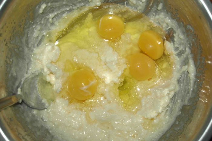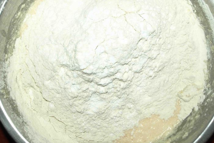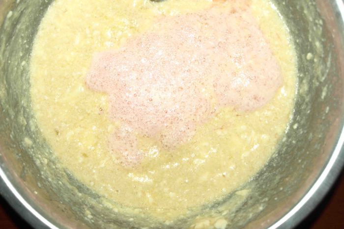 Добавить просеянную муку с разрыхлителем. Перемешать.