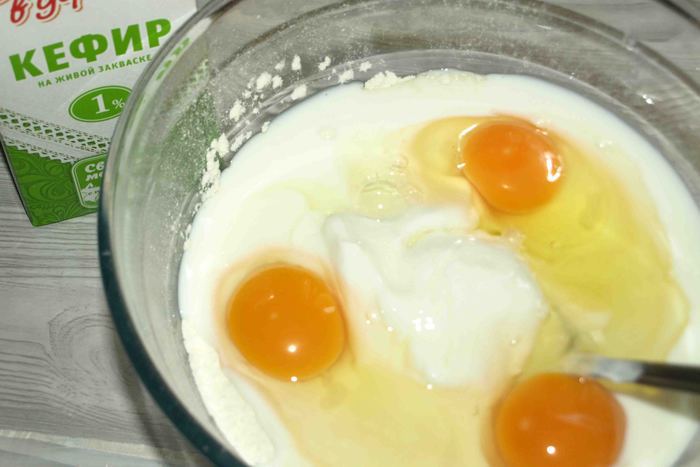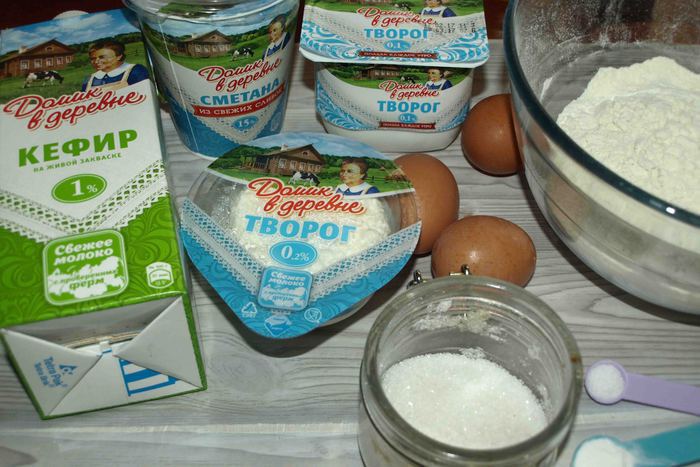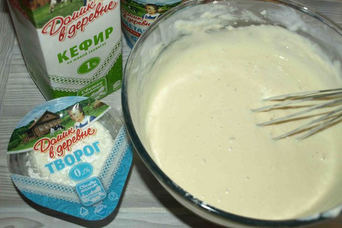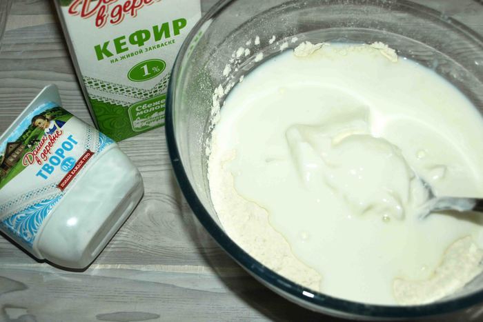 Муку просеять, добавить соль, сахар, кефир 1% «Домик в деревни», творог 0,1 «Домик в деревни».