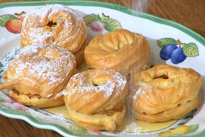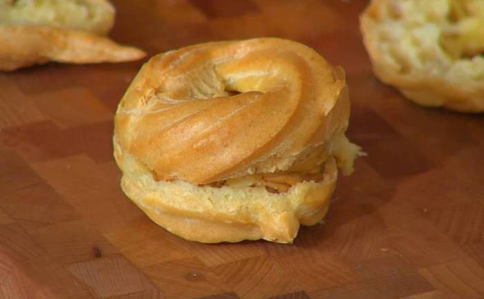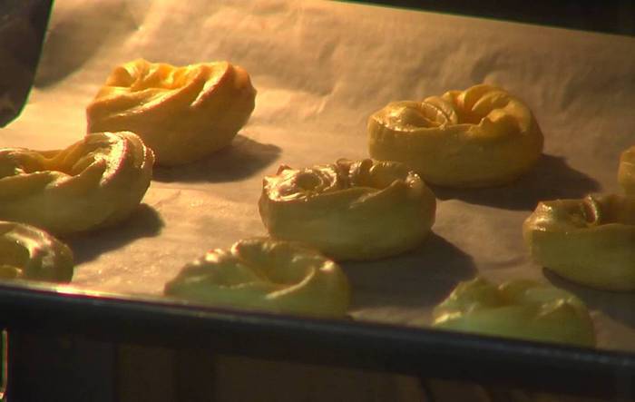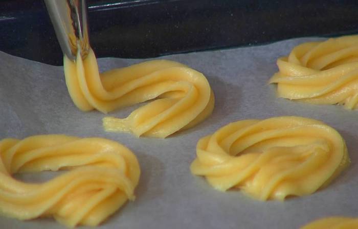 Тесто выложить в кондитерский мешок и выдавить в виде колец на противень, выстеленный пищевой бумагой.