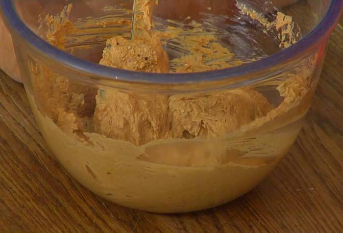 Яйца разбить в стакан и по одному вливать в тесто, каждый раз вымешивая, — тесто должно получиться гладким, блестящим и немного тянущимся. Последнее яйцо размешать вилкой и вливать частями — возможно, будет достаточно половины яичной массы.