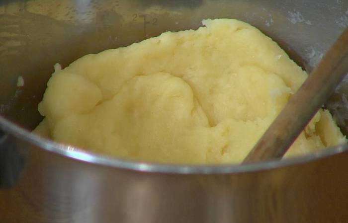 Всю муку сразу (это важно!) всыпать в кастрюлю с водой и маслом, вымешать тесто деревянной лопаткой и дать ему немного остыть.