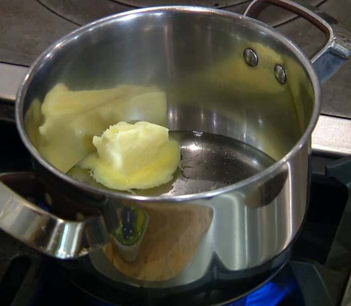 В большую кастрюлю влить 225 мл воды, добавить сливочное масло, соль и довести все до кипения, затем снять с огня.