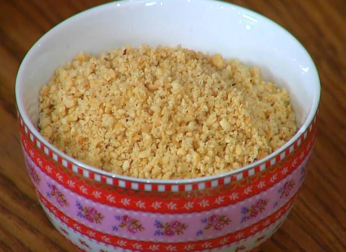 Фундук измельчить в блендере в мелкую крошку.