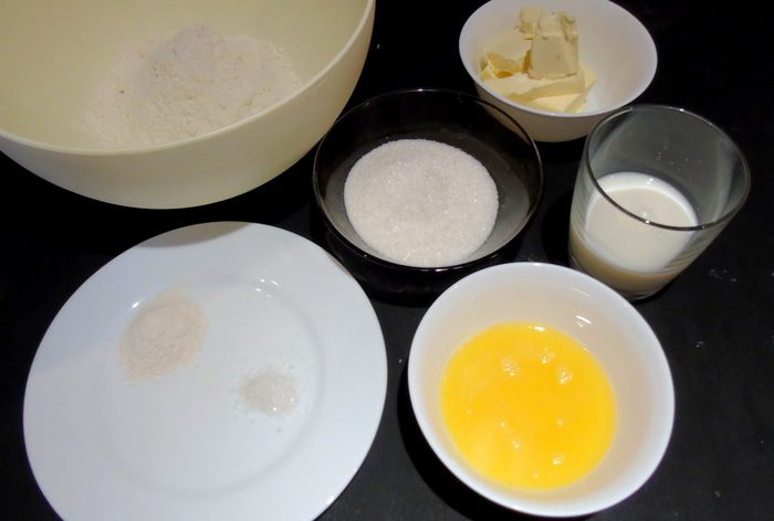 Приготовьте все продукты. Муку смешайте с солью и разрыхлителем.