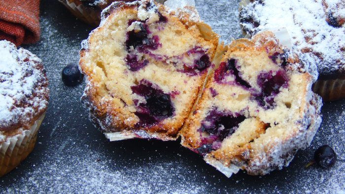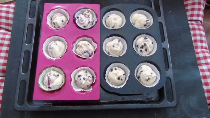 Добавьте ягоды в тесто перед самой выпечкой. Если тесто будет сильно густое, дайте ему постоять минут 10 — 15 при комнатной температуре или пробейте миксером 1 минуту.
