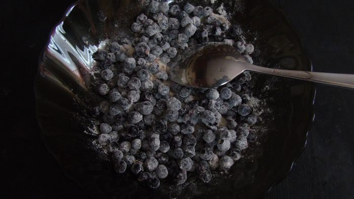 Чернику обваляйте в муку. Если замороженная, не размораживайте.