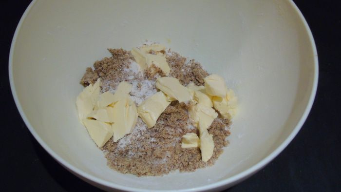 Для штрейзеля: из орехов приготовьте муку или возьмите готовую ореховую муку, орехи подойдут любые, я брала грецкие. Масло нарежьте кусочками. Соедините все ингредиенты и перемешайте тщательно пальцами.