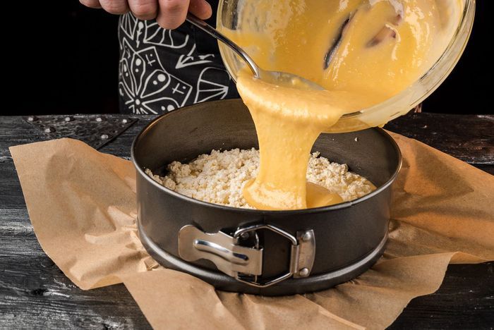 Смазать разъемную форму растительным маслом, вылить половину теста, затем выложить и аккуратно распределить творожную массу, залить второй половиной теста.