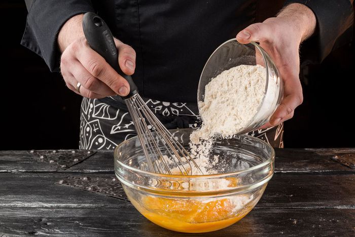 Хорошо взбить яйца с 1 стаканом сахара и щепоткой соли, добавить муку.