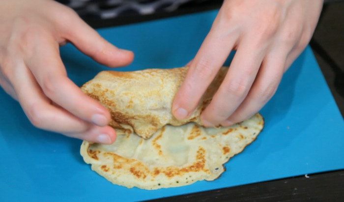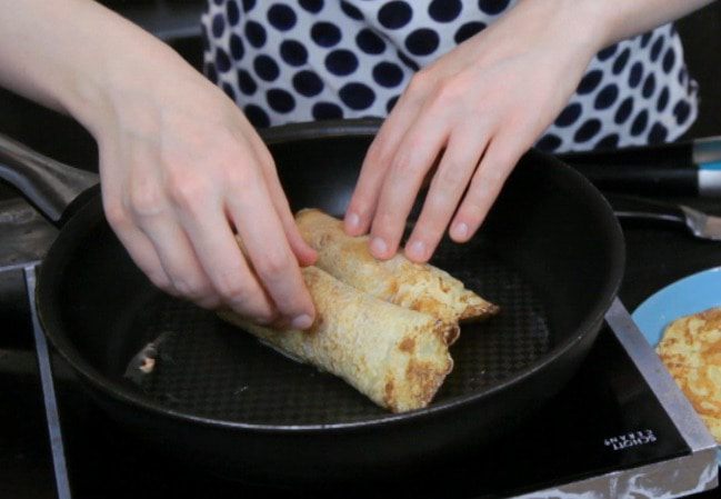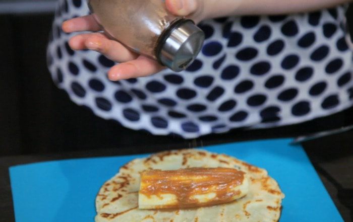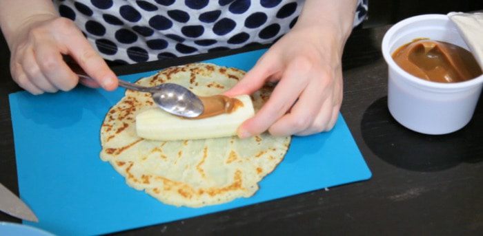 Подогнать банан под размер блина, смазать его со всех сторон вареной сгущёнкой.