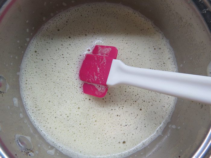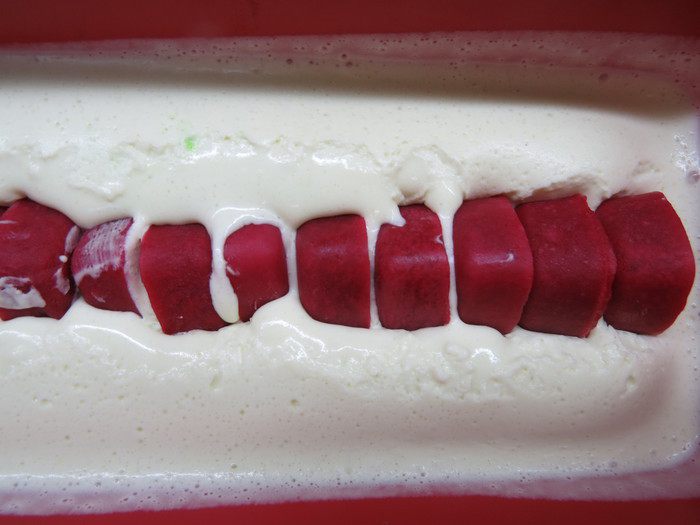 Делаем малиновые сердца. Желатин замочить в холодной воде. В сотейнике смешать малиновое пюре, воду и сахар. Поставить на огонь и при периодическом помешивании довести до кипения. Как только закипит, сразу снять с огня, немного остудить, помешивая, и ввести размоченный и отжатый желатин. Перемешать. Полученную жидкость разлить по маленьким силиконовым формочкам-сердечкам. Дать остыть при комнатной температуре, затем заморозить.