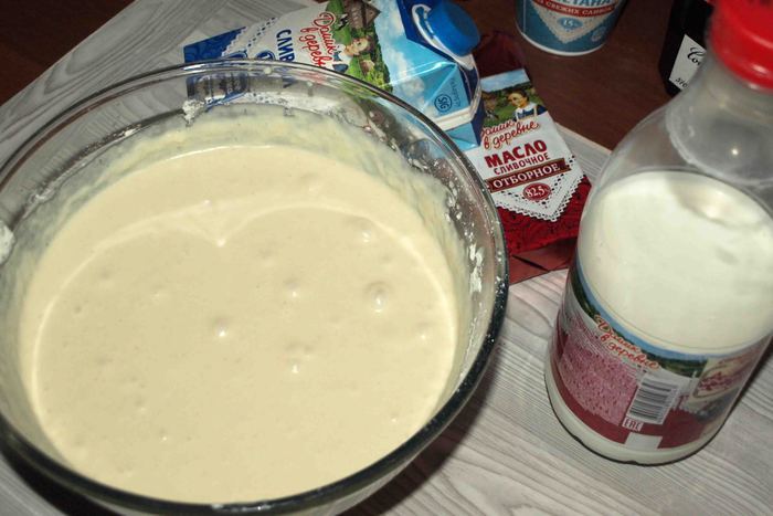 Масло растопить, остудить. Добавить к яично-молочной смеси. Взбить.