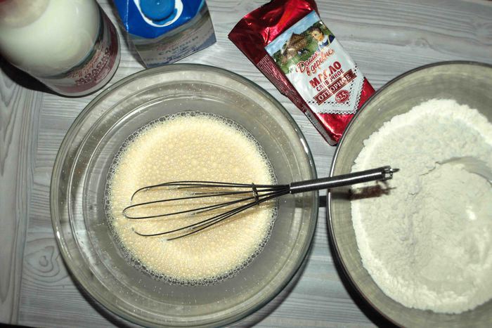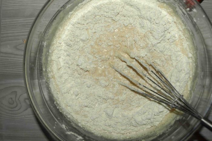 Соединить муку с полученной смесью. Взбить, чтоб не было комочков. Белки взбить в некрепкую пену.