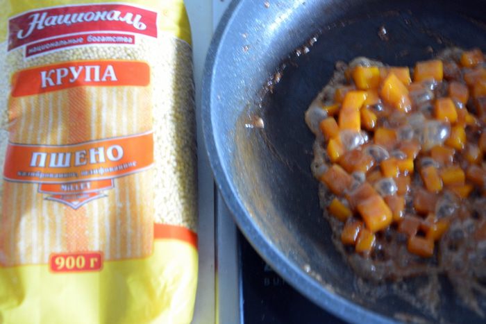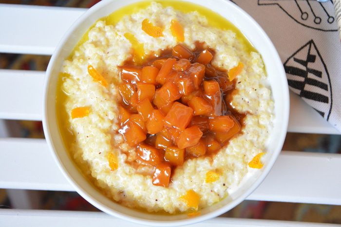 Заправить кашу сливочным маслом. Сверху выложить карамелизированную тыкву и посыпать апельсиновой цедрой.