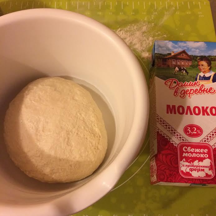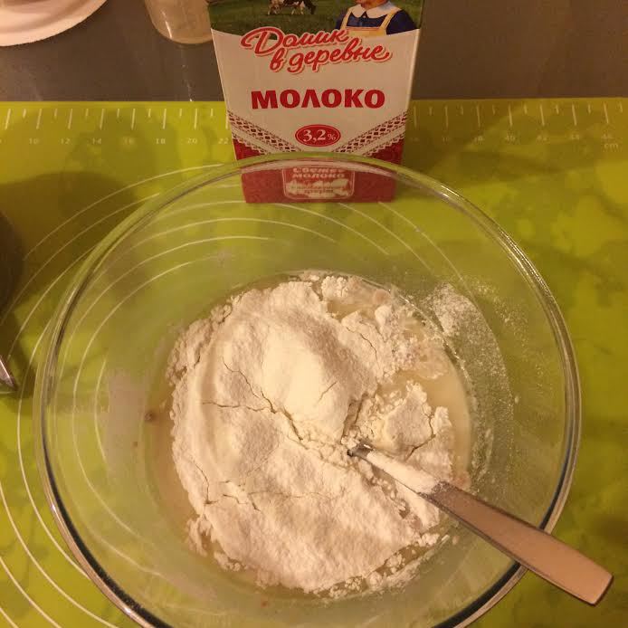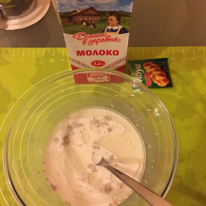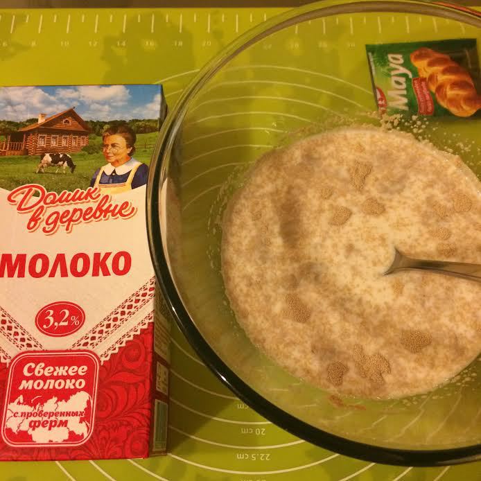 В теплом молоке «Домик в деревне» развести дрожжи, соль и сахар.