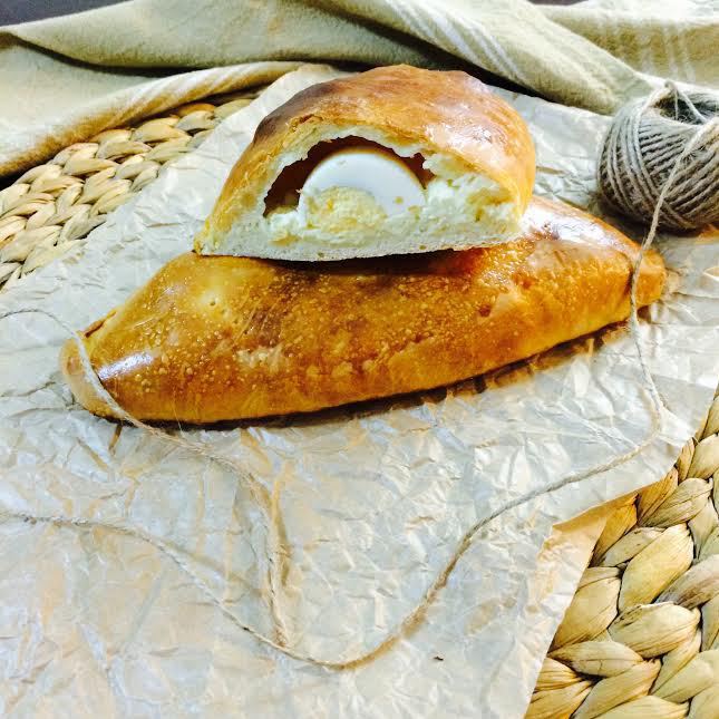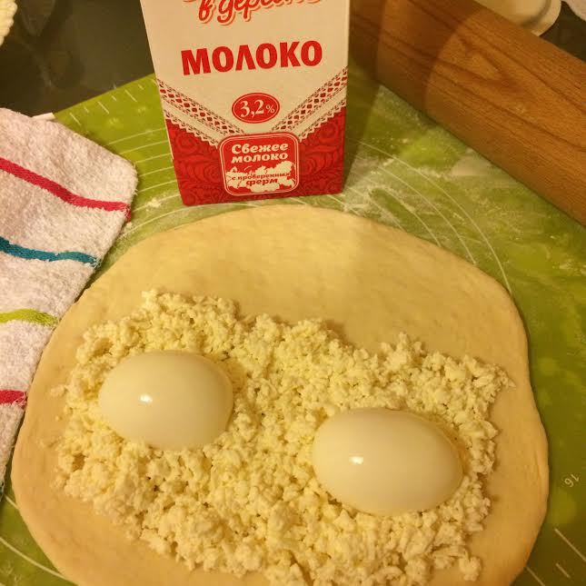 Раскатать одну часть теста. Одну половину теста посыпать сыром, сверху положить 2 половинки яйца.