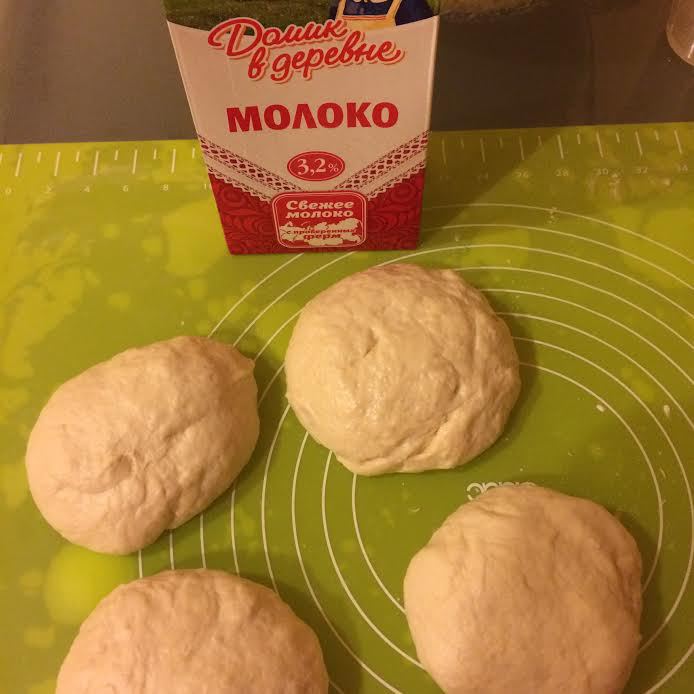 Духовку нагреть до 190°С. Тесто обмять, разделить на 4 части.