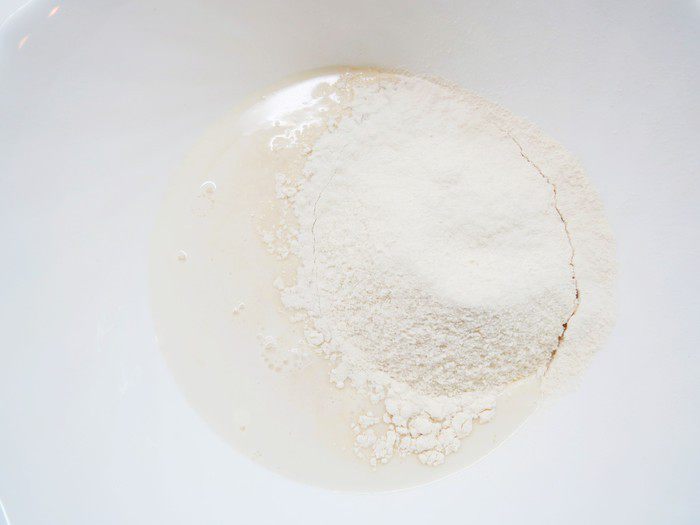 В дрожжевую смесь добавляем молоко «Домик в деревне» 2,5%, муку, смешанную с разрыхлителем и все хорошо перемешиваем. Оставляем на 20 минут.