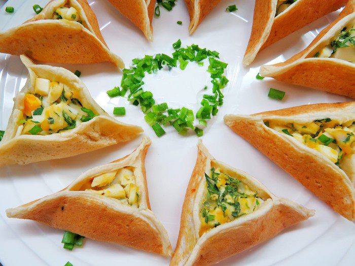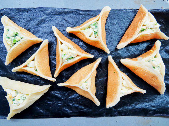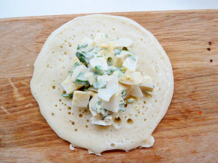 В нашей семье очень любят арабские блинчики, только вот начинку мы предпочитаем совсем не арабскую. Предлагаю вам приготовить такие блинчики с начинкой из вареного яйца, зелени и сметаны «Домик в деревне». Поверьте, равнодушным не останется никто. Кроме того, блинчики такой формы очень удобно есть детям.