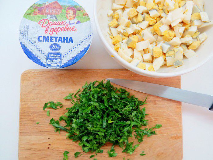 Пока тесто отдыхает, приготовим начинку. Вареные яйца режем кубиком, зелень и лук мелко нарезаем.